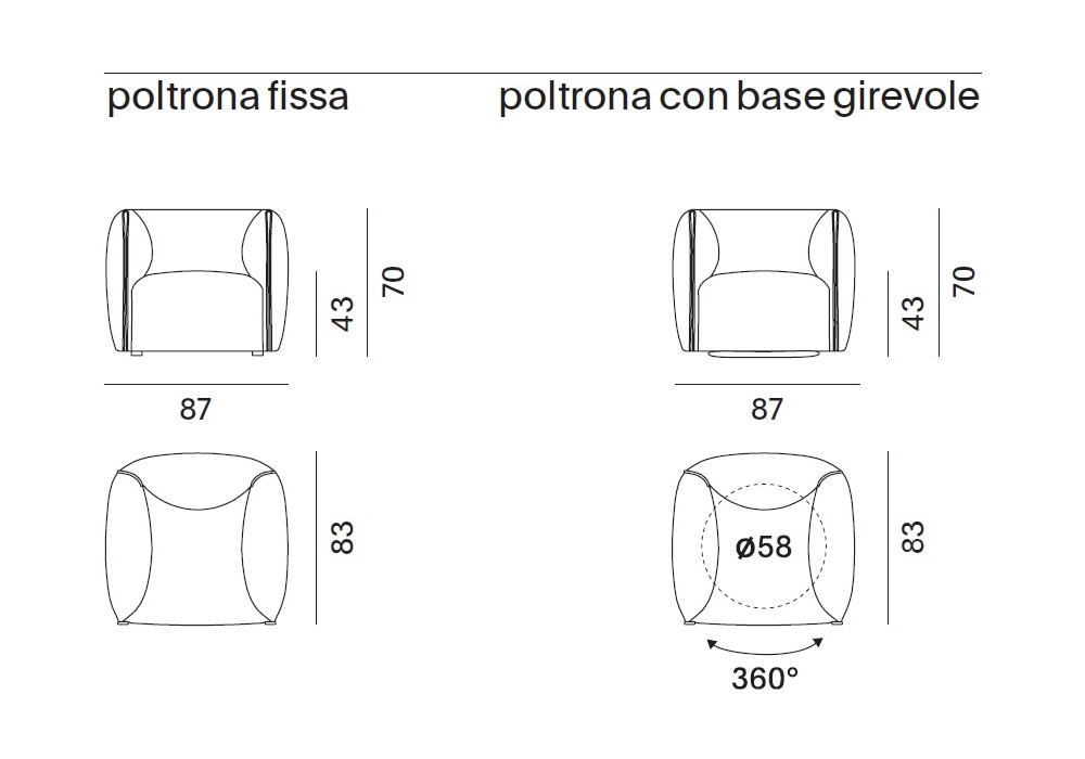 Mia von Francesco Bettoni für MDF Italia entworfen, ist ein Sessel mit tragender Struktur aus Massivholz und Sperrholz, Untergestell mit elastischen Riemen, Polsterung aus Polyurethanschaum unterschiedlicher Dichte und Polsterung aus Polyesterwatte. Der Bezug ist abnehmbar und in verschiedenen Stoffen und Ausführungen erhältlich. Erhältlich in fester oder drehbarer Ausführung.
