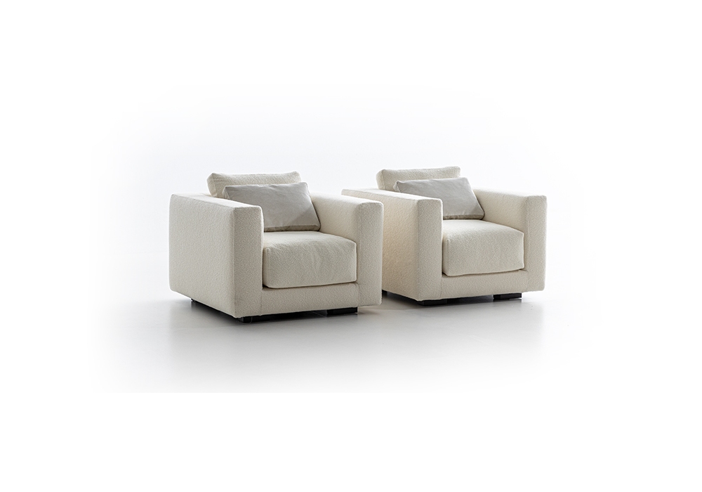 Salon Nanà von Annabel Karim Kassar für Moroso entworfen, ist ein Sessel aus Polyurethanschaum und Polyesterfaser auf Holzrahmen. Sitzkissen sind aus Gänsedaunen über Polyurethanschaum. Rückenkissen sind aus Polyurethanschaum. Füße aus lackierter Buche mit dem Rahmen verschraubt.