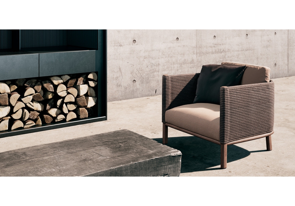 Giro von Vincent Van Duysen für Kettal entworfen ist ein strukturierter Sessel mit Gestell aus Teakholz. Der Körper ist mit gewebtem Seil mit gepolsterten und gepolsterten Kissen bedeckt. Giro ist in verschiedenen Ausführungen erhältlich.