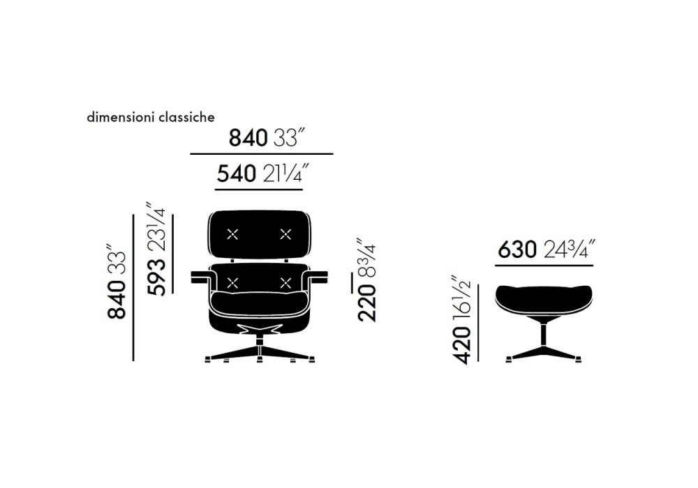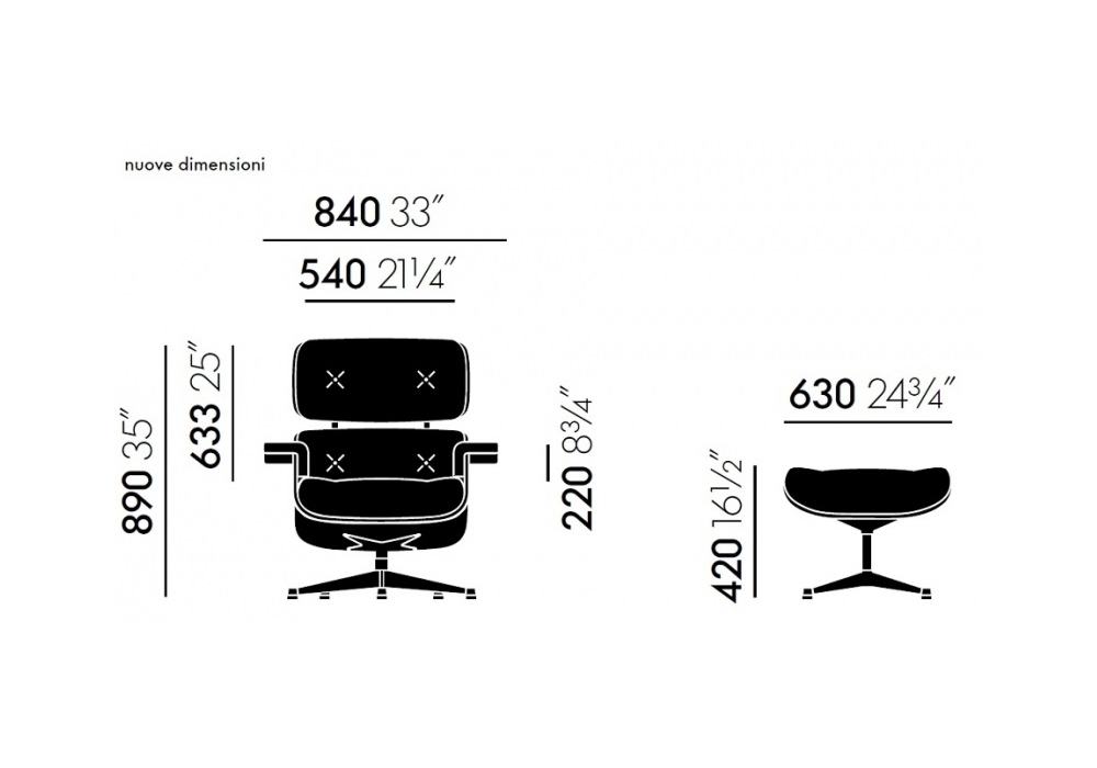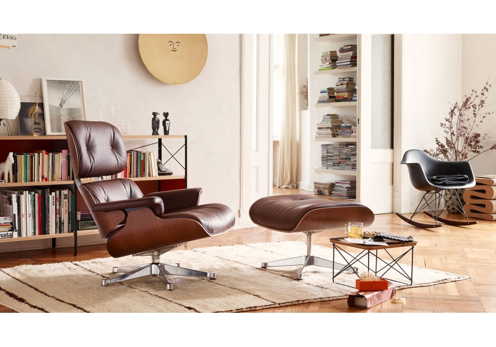 Lounge Chair & Ottoman von Charles & Ray Eames für Vitra entworfen, ist ein Sessel mit Fußstütze mit Lederbezug, Gestell aus poliertem Aluminium oder mit schwarzen Seiten und harten Kufen oder mit Filzeinlagen. Schale aus schwarz pigmentiertem Nussbaum.