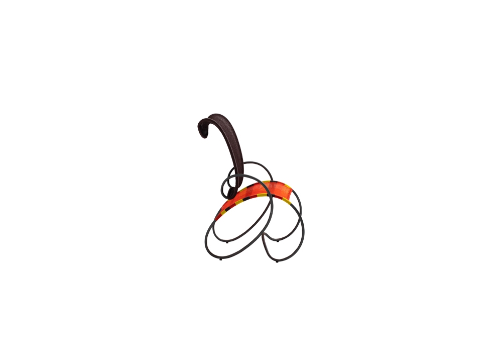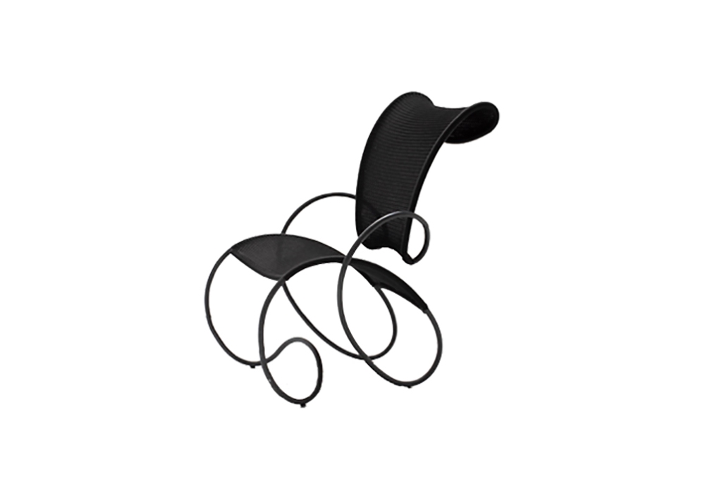 Modou von Ron Arad für Moroso entworfen, ist ein Sessel aus rostfreiem Stahlrohrgestell und mit handgewebter Polyethylenschnur umwickelt. PVC-Gleiter.