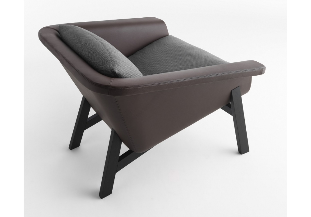 Sienna von Studio Balutto für Casamania & Horm entworfen, ist ein Sessel mit Gestell aus massiver schwarzer Esche, Sitzschale aus feuerhemmendem kaltgeschäumtem Polyurethanschaum, Sitz- und Rückenkissen mit Gänsedaunen gepolstert. Bezug in Leder, Kunstleder oder Stoff.