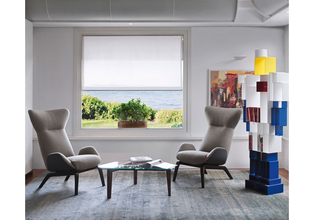 Soho von Studio Balutto für Casamania & Horm entworfen, ist ein Sessel mit Gestell aus massiver schwarzer Esche, Sitzschale aus feuerhemmendem kaltgeschäumtem Polyurethanschaum und Bezug aus Leder, Kunstleder oder Stoff. Die Bezug kann monocrom (Vorder- und Rückseite gleich) oder zweifarbig sein.