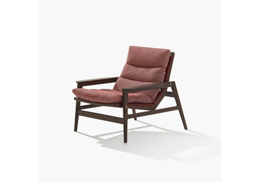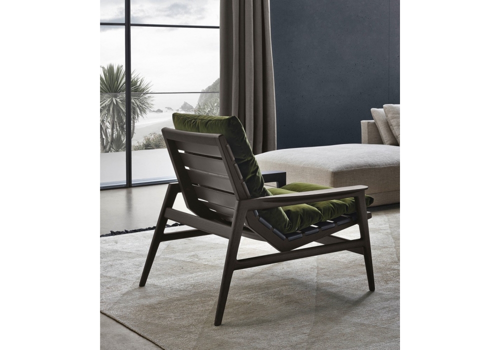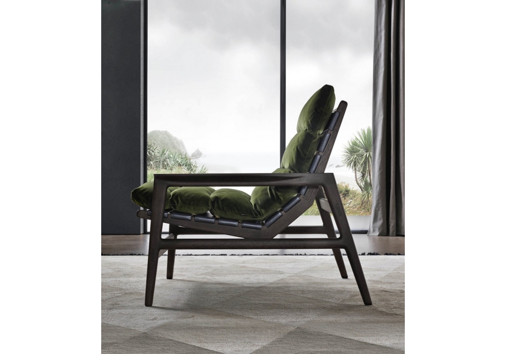 Ipanema von Jean Marie Massaud für Poliform entworfen, ist ein Sessel mit Massivholzstruktur, Sitz mit Ledergurten und Sitzkissen mit Federpolsterung, Unterbezug aus Baumwollcanvas und Bezug aus Stoff oder Leder.