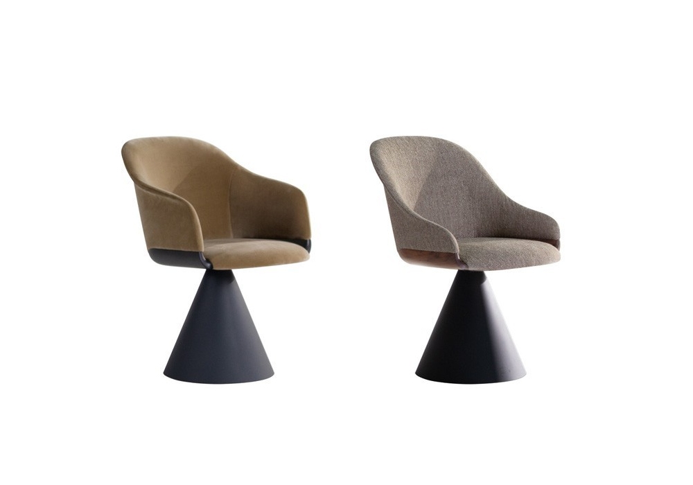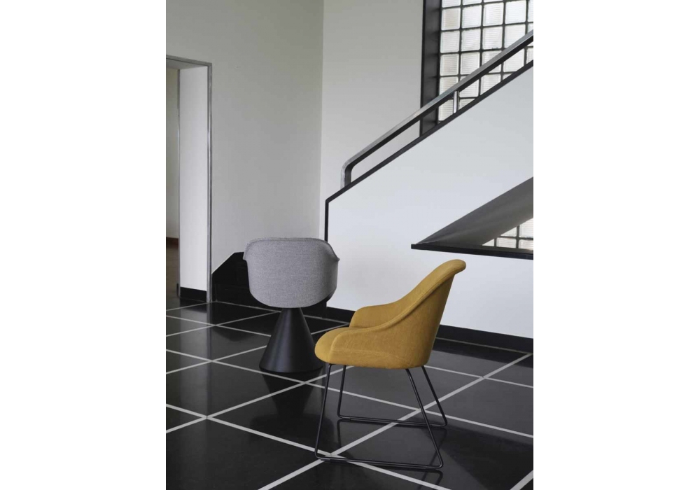 Lyz, von Mario Ferrarini für Potocco entworfen, ist ein Sessel, der durch die Kombination von Metall und Eschenholz oder Canaletto-Nussbaum in verschiedenen Ausführungen strukturiert ist. Die Basis hat eine konische Form aus geprägtem schwarz oder anthrazit lackiertem Metall. Sitz und Rückenlehne sind mit feuerfestem Polyurethanschaum gepolstert und mit verschiedenen Stoffen, Leder oder Kunstleder bezogen.