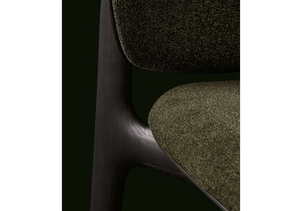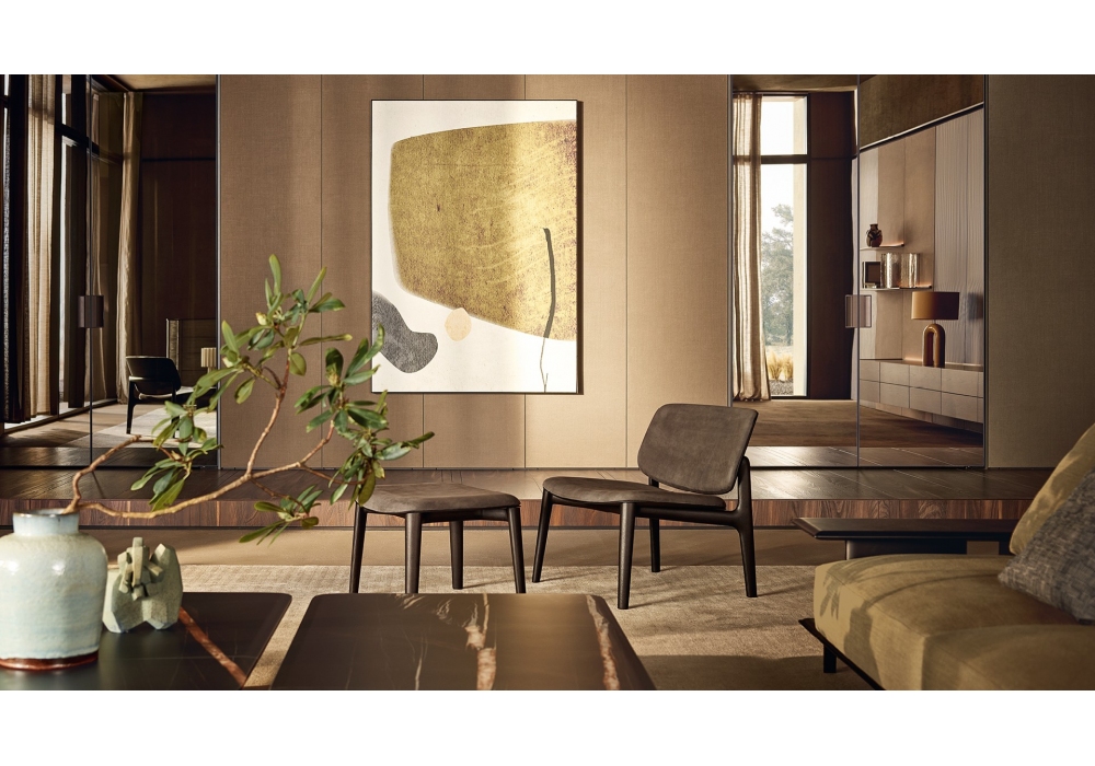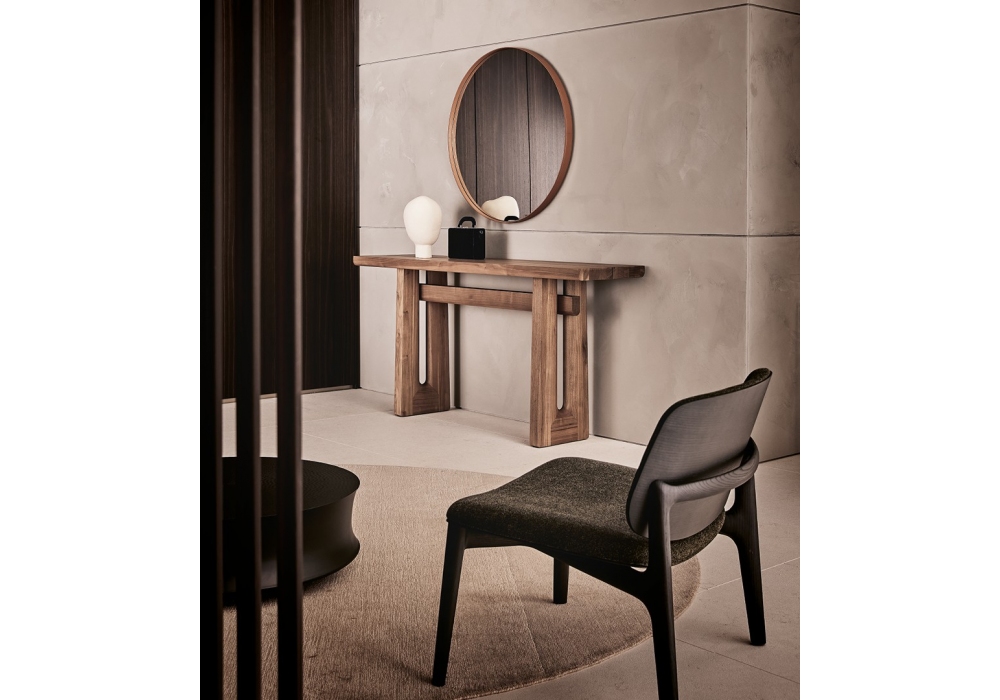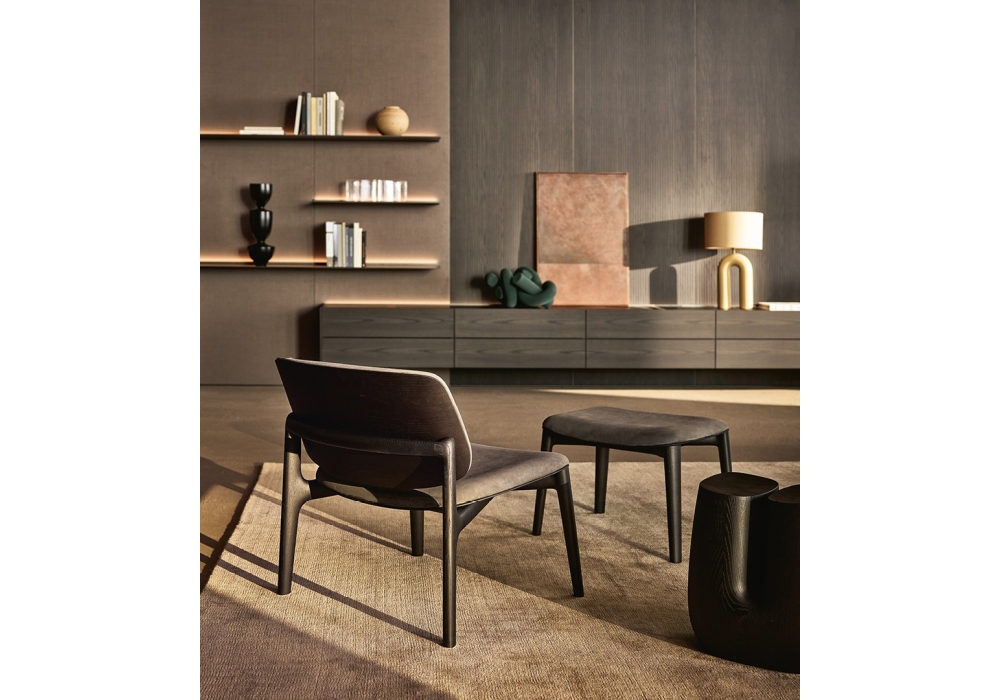 Curve, von Emmanuel Gallina für Poliform entworfen, ist ein Sessel mit Struktur aus Massivholz, Spessart-Eiche oder schwarzer Ulme. Polsterung in Stoff oder Leder erhältlich.