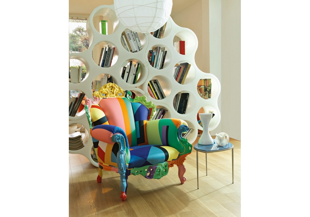 Proust Geometrica von Alessandro Mendini für Cappellini entworfen, ist ein Sessel mit Holzstruktur und mehrfarbiger Baumwollbezug.