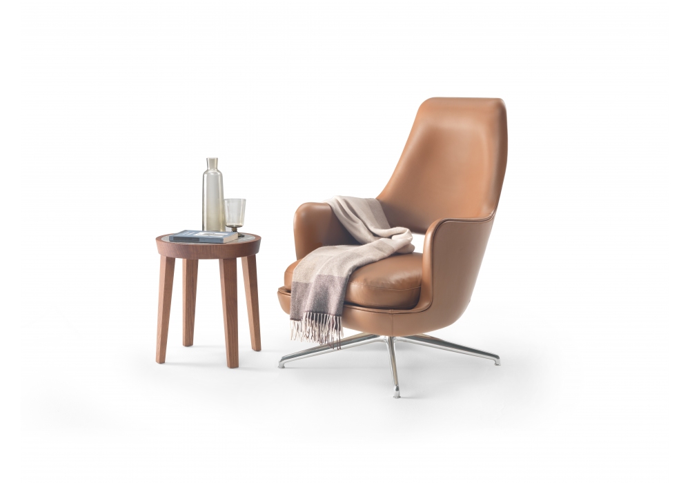 Eliseo, von Antonio Citterio für Flexform entworfen, ist ein Bergère mit drehbarer Aluminiumbasis mit Rückholmechanismus, doppeltem Polyurethankörper und Stoff- oder Lederpolsterung.