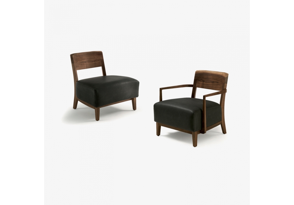 Wilma von Terry Dwan für Riva 1920 entworfen, ist ein Sessel mit Struktur aus Massivholz, mit Rückenlehne mit natürlicher Kante und bequemer gepolsterter Sitzfläche aus Leder oder Stoff mit sichtbaren Nähten. Erhältlich in der Version mit oder ohne Armlehnen.