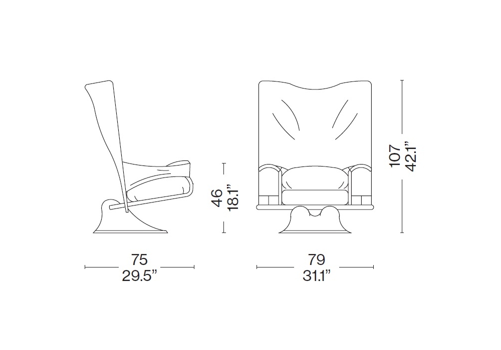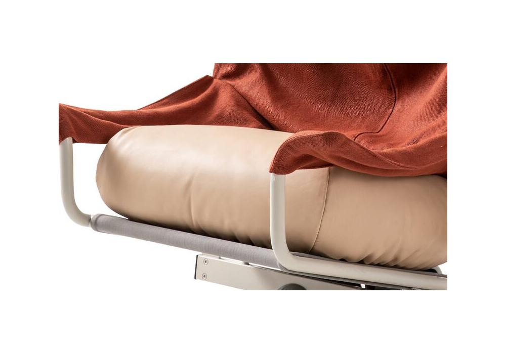 650 AEO von Archizoom / P. Deganello für Cassina entworfen, ist ein Sessel mit Sitzrahmen aus lackiertem Stahlrohr. Das Sitzkissen ist mit Polyurethanschaum und Polyesterwatte gepolstert. Der Bezug ist aus Stoff oder Leder erhältlich. Sitz und Rückenlehne können unterschiedliche Polstermaterialien und Farben aufweisen.