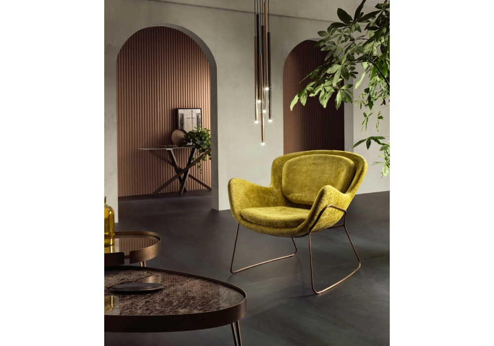 Meghan von Carlesi Tonelli Studio für Riflessi entworfen, ist ein Sessel mit Struktur aus Aluminiumdruckguss und lackiertem Kufengestell. Sitz und Rückenlehne mit festem Stoff bezogen. Polsterung aus flammhemmendem und unverformbarem, kaltgeformtem, flexiblem Polyurethan. Dekorativer Reißverschluss. Verfügbar in mehreren Ausführungen.