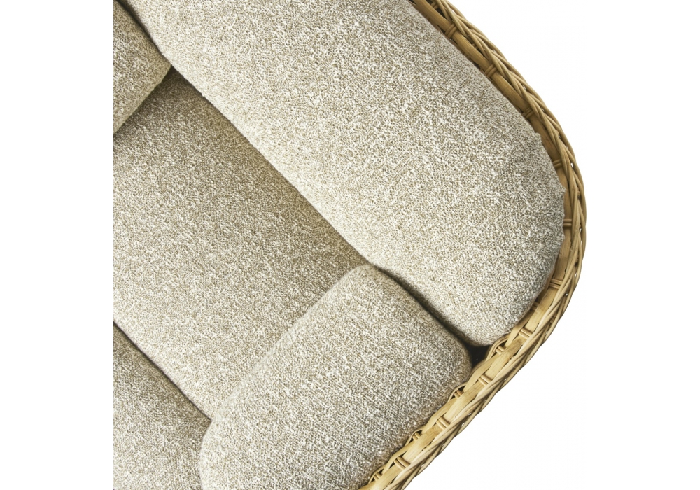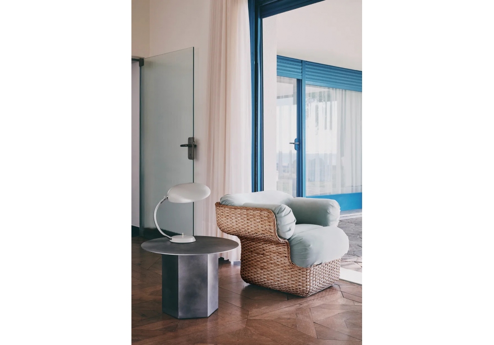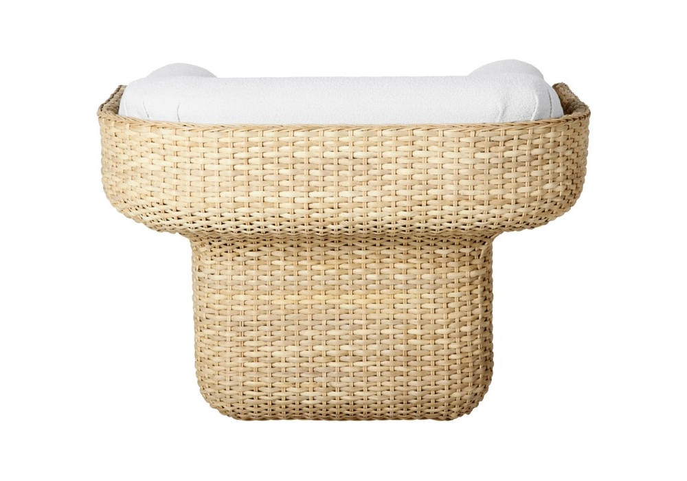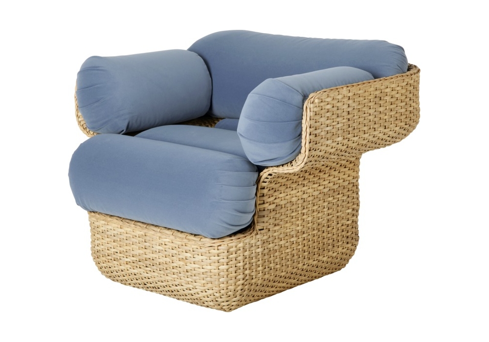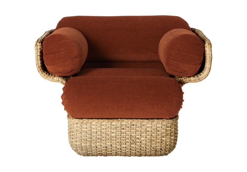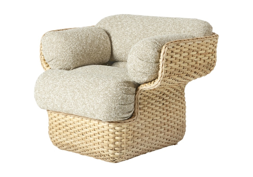 Basket von Joe Colombo für Gubi entworfen, ist ein Sessel mit Rattanbasis und Stoffbezug.