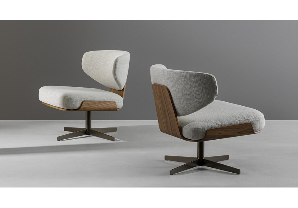 Olos, von Mauro Lipparini für Bonaldo entworfen, ist ein Sessel mit nicht abnehmbarem Bezug, verfügbar in verschiedenen Stoffen und Farben. Die Struktur besteht aus furniertem Holz in Canaletto-Nussbaum oder Kohleiche. Der drehbare Fuß besteht aus Metall in verschiedenen Ausführungen.
