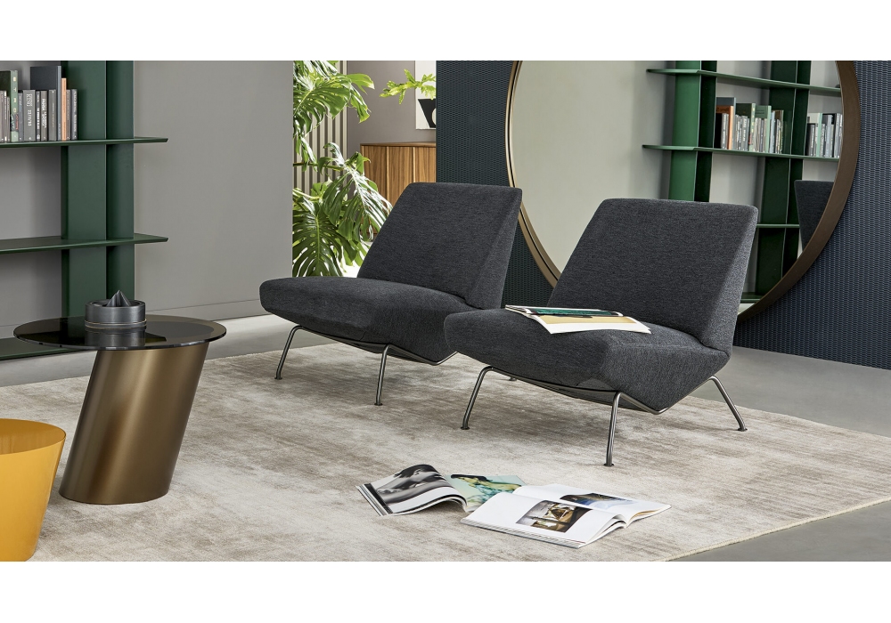 Sleek von Mauro Lipparini für Bonaldo entworfen, ist ein Sessel mit nicht abnehmbarem Bezug, verfügbar in verschiedenen Stoffen und Farben. Die Struktur aus lackiertem Metall in verschiedenen Ausführungen kann mit festen Beinen oder mit vier Raketen mit drehbarem zentralem Drehpunkt hergestellt werden.