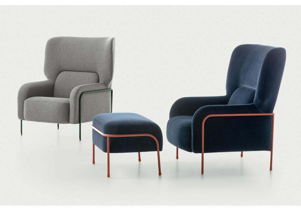 Platea von Emilio Nanni für Pianca entworfen, ist ein Sessel mit interner Struktur mit einem inneren Holzrahmen, Polsterung aus Polyurethanschaum unterschiedlicher Dichte, wärmegebundener Watte und Samtbezug. Basis aus gefaltetem und verschweißtem matt lackiertem Stahl oder Metall, verziert mit einer glänzenden Metallzwinge aus Messing. Nicht abnehmbare Stoff- und Lederpolsterung. Verfügbar mit oder ohne Pouf.