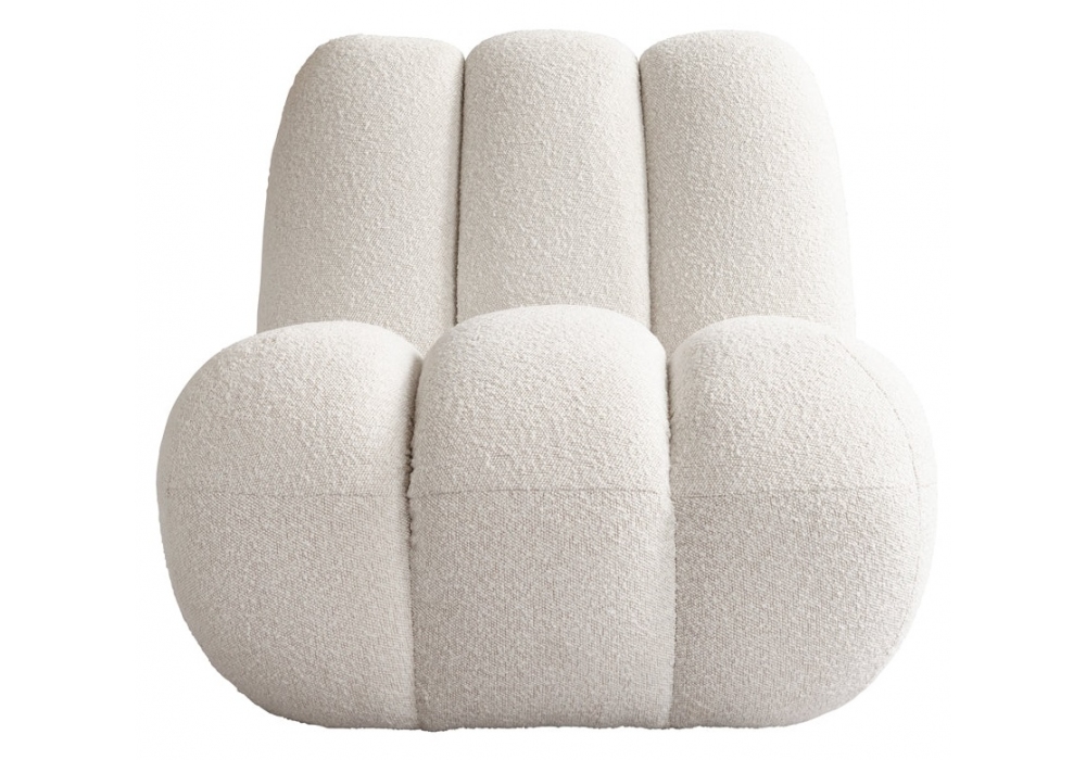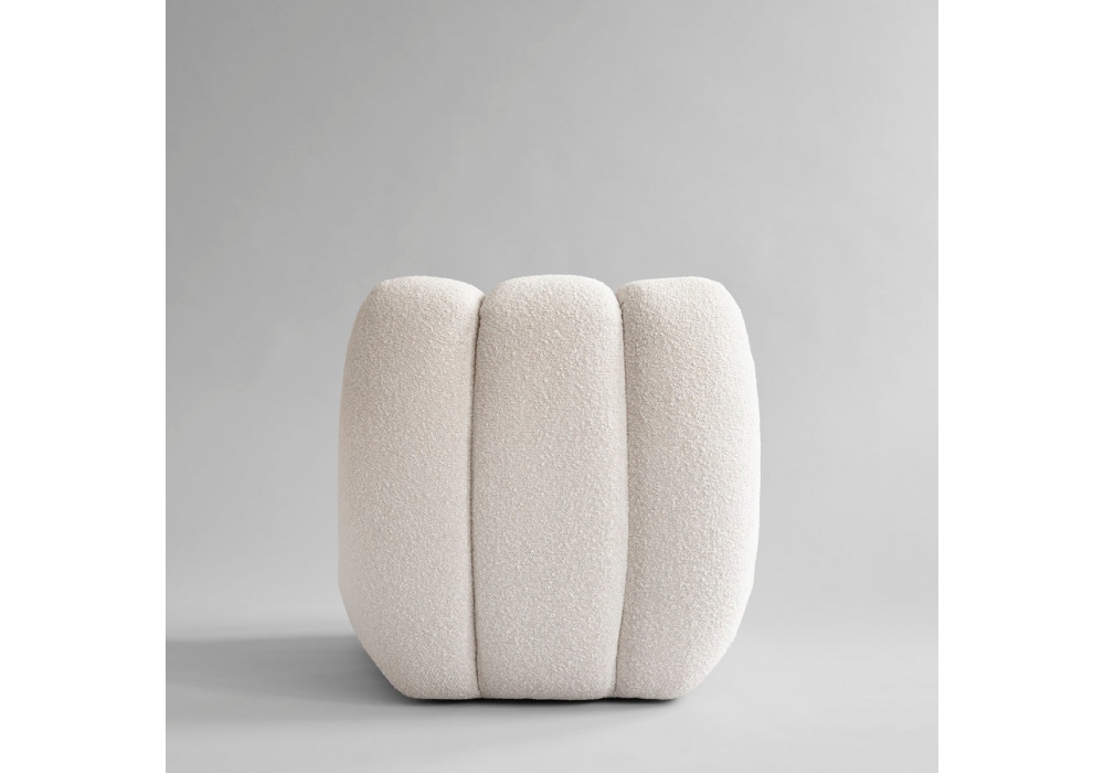Toe von Kristian Sofus Hansen & Tommy Hyldahl für 101 Copenhagen entworfen, ist ein gepolsterter Sessel mit Bezug aus cremefarbenem Bouclé-Stoff.