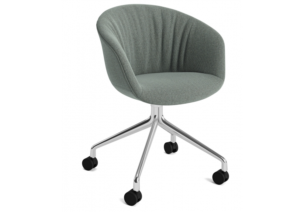 About a Chair AAC 25 Soft von Hee Welling & Hay für Hay entworfen, ist ein Drehsessel mit Sitz aus geformtem Polypropylen mit Armlehnen und integrierter Polsterung mit integriertem Steppteil, 4-Speichen-Drehgestell aus Aluminiumguss mit Rädern. Verfügbar in mehreren Polsterungen.