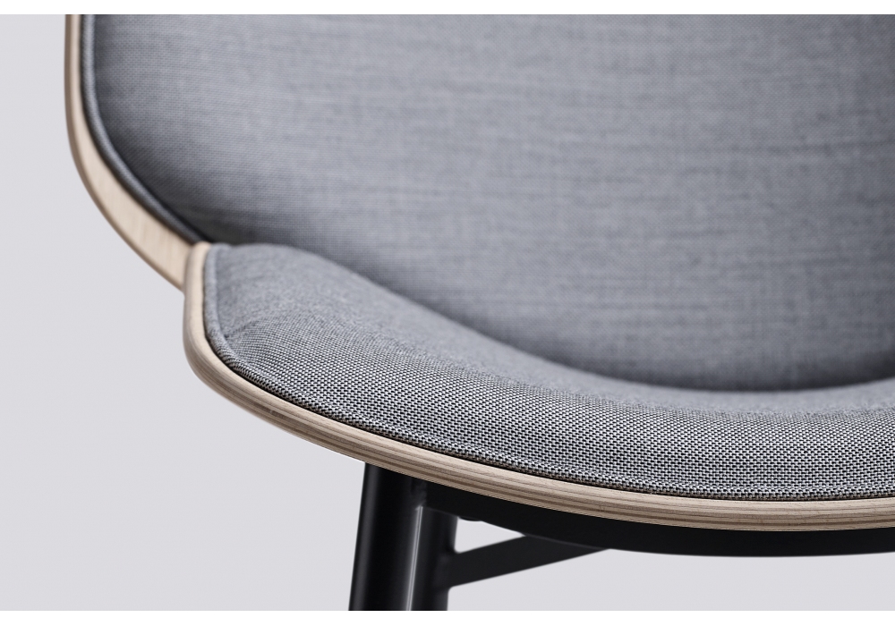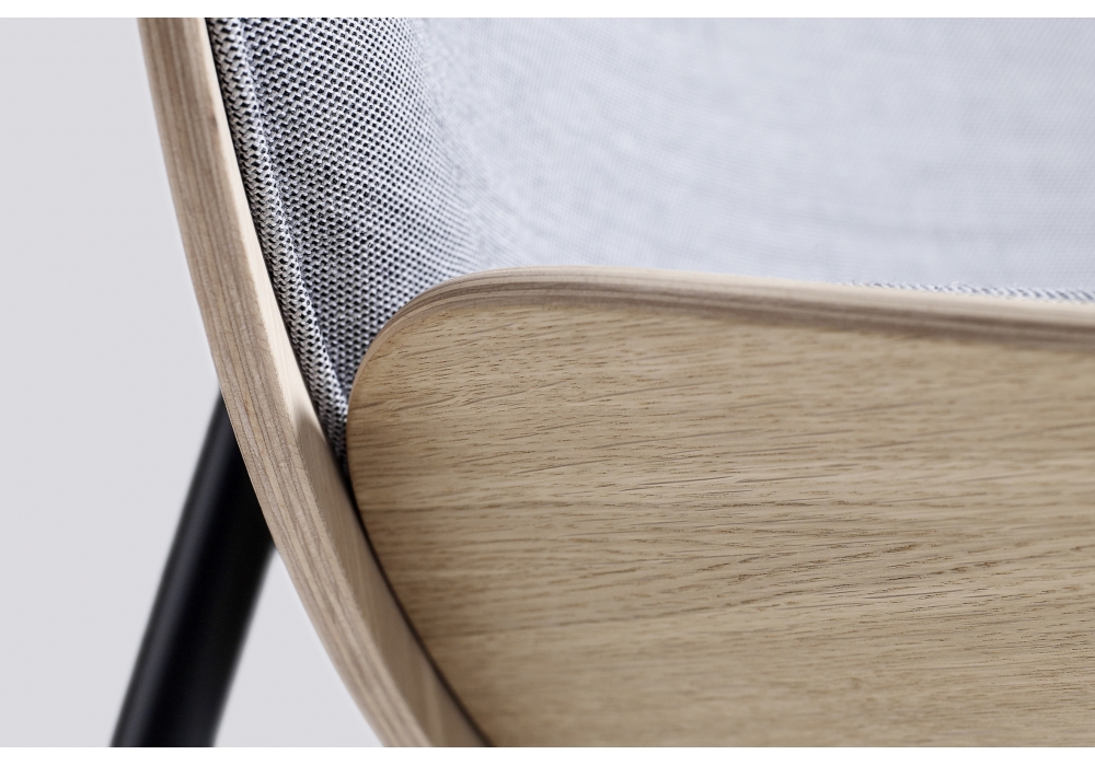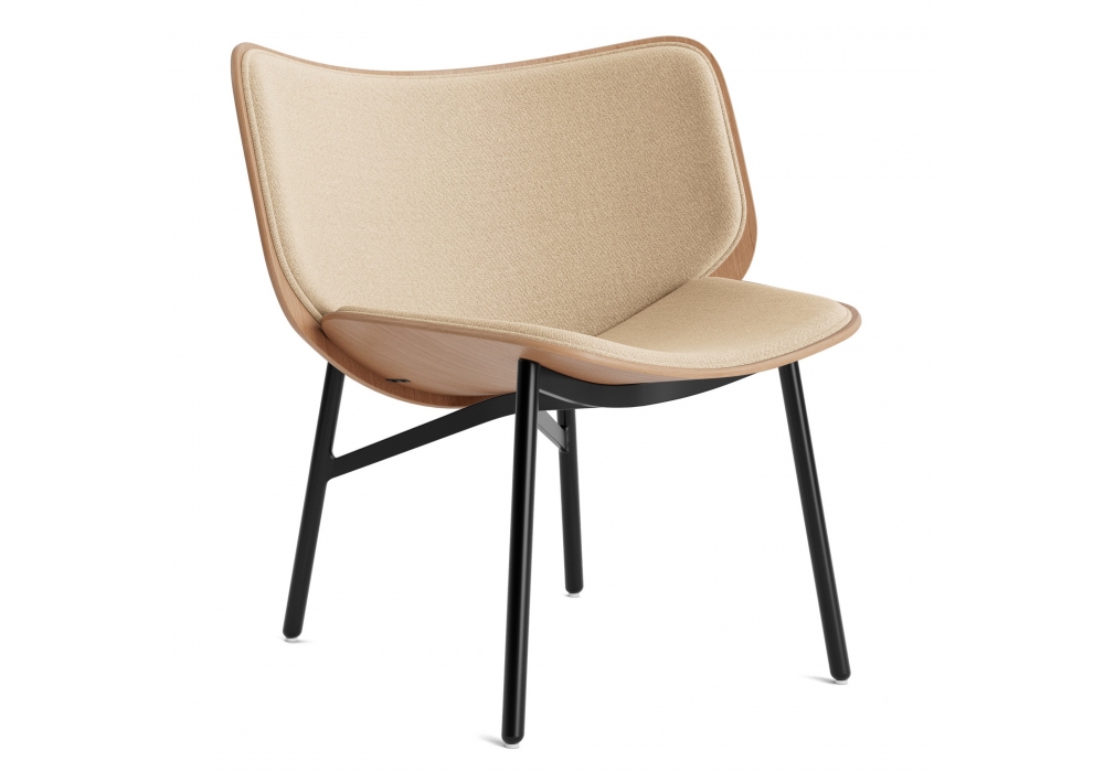 Dapper von Doshi Levien für Hay entworfen, ist ein Sessel, der aus zwei geformten Schalen aus Sperrholz mit Eichenfurnier, Innenbezug aus Leder oder Stoff und Beinen aus schwarz pulverbeschichtetem Stahl besteht. Verfügbar in verschiedenen Polsterungen.