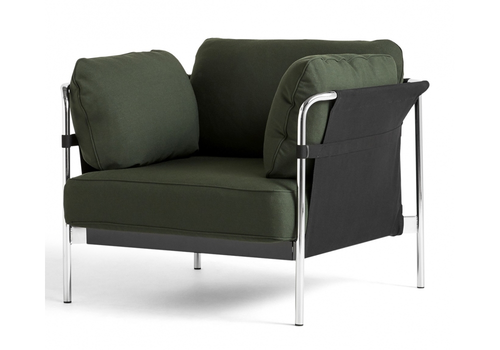 Can 1 Seater von Ronan & Erwan Bouroullec für Hay entworfen, ist ein Sessel mit Struktur aus verchromtem oder schwarz pulverbeschichtetem Stahl, äußerem Segeltuch in Natur oder Schwarz und Polsterung aus Leder oder Stoff. Verfügbar in verschiedenen Polsterungen.