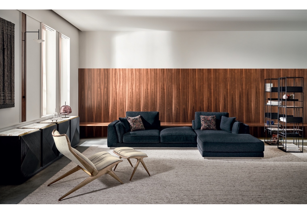 Aurora, von Draga & Aurel für Opera Contemporary entworfen, ist ein Lounge Chair mit Struktur aus Eschen- oder Canaletto-Walnussholz und Metall. Gummipolsterung und Lederbezug. Verfügbar mit oder ohne Ottomane.