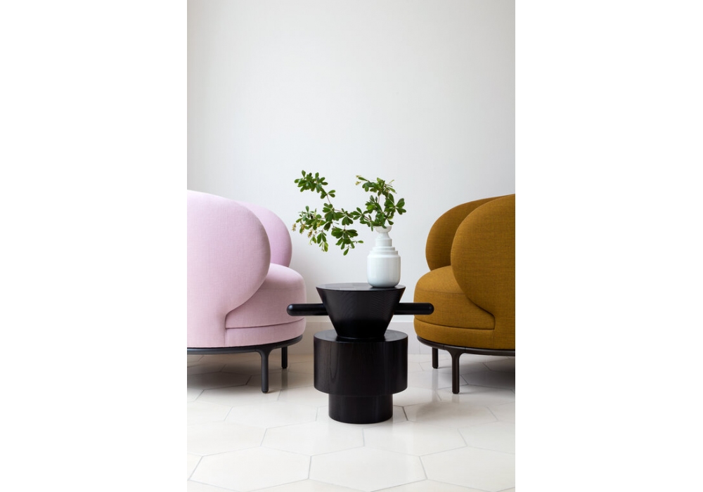 Vuelta von Jaime Hayon für Wittmann entworfen, ist ein Sessel mit Struktur aus Holz und Metall und Bezug aus Stoff, Samt oder Leder. Erhältlich in verschiedenen Ausführungen.