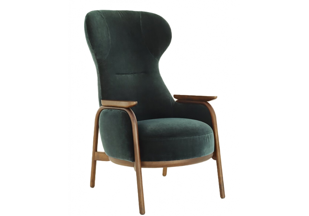Vuelta Hohe Rückenlehne von Jaime Hayon für Wittmann entworfen, ist ein Sessel mit Struktur aus Holz und Metall und Bezug aus Stoff, Samt oder Leder. Erhältlich in verschiedenen Ausführungen.