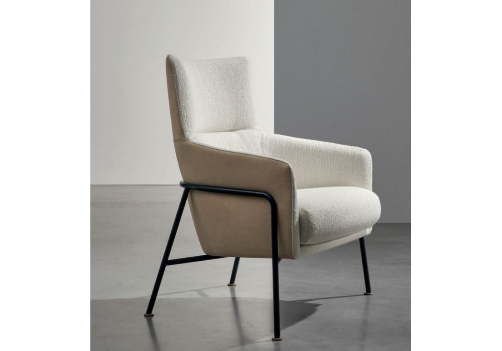 Adele von Antonio De Marco für Twils entworfen, ist ein Sessel mit Polsterung aus Polyurethanschaum, mit interner Struktur aus MDF und Holzfaser und Basis aus massivem Pappel- und Tannensperrholz. Die Außen- und Innenverkleidungen sind in verschiedenen Stoffen und Farben erhältlich. Die Füße sind aus dunkelgrau lackiertem Metall und die Spitzen in 5 Ausführungen.