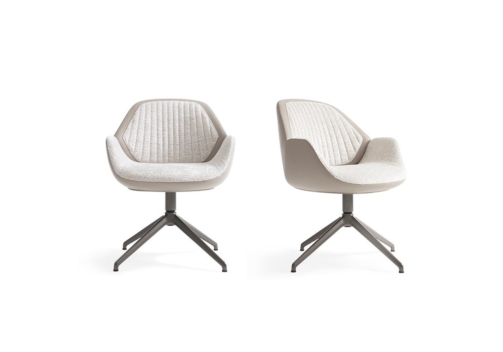 Calathea Pewter, von Roberto Lazzeroni für Giorgetti entworfen, ist ein Bürosessel für Gäste mit einem Gestell aus Zinnmetall. Gesteppte Polsterung in verschiedenen Ausführungen, Außenschale aus Leder.
