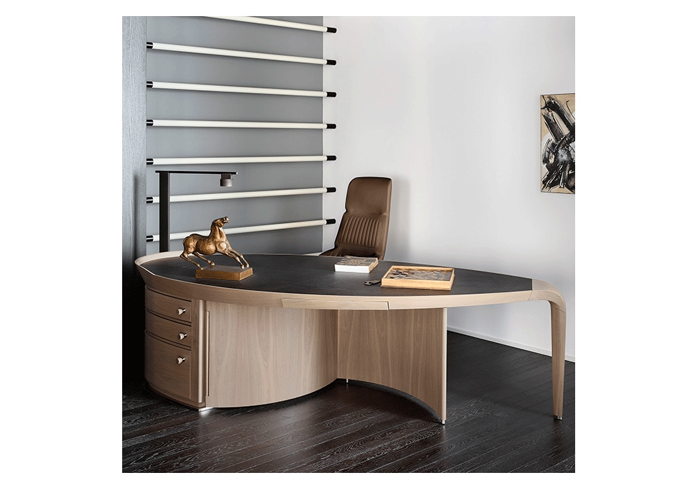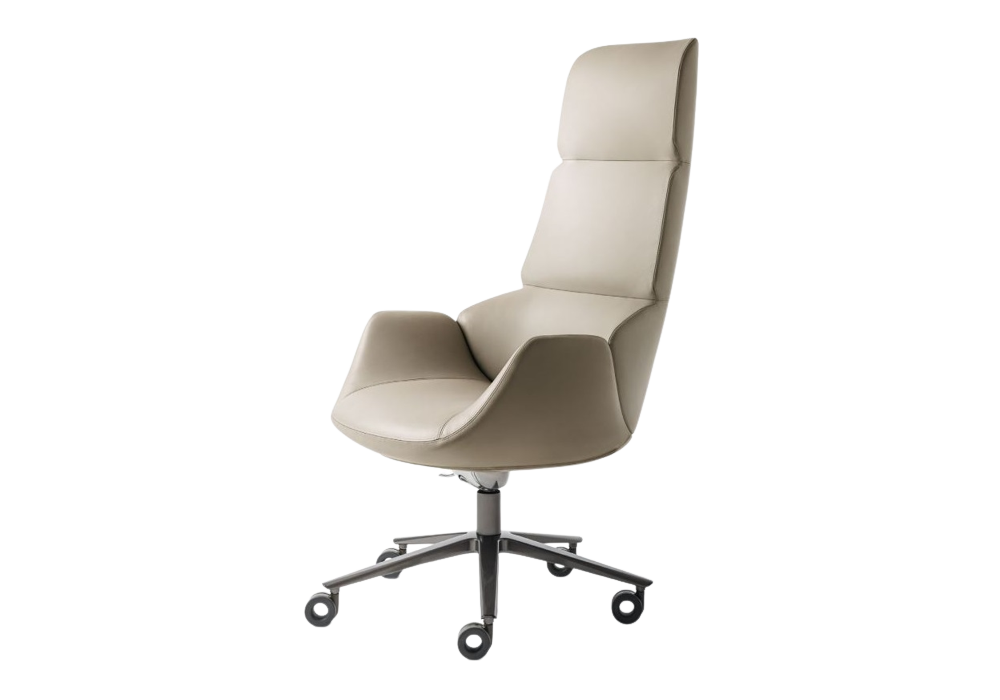 Calathea, entworfen von Roberto Lazzeroni für Giorgetti, ist eine Executive-Bergère mit Sockel aus Zinnmetall. Lederpolsterung, auch in zwei verschiedenen Farben für die Karosserie und den Innenraum erhältlich. Die Basis ist drehbar mit Rädern und höhenverstellbar.