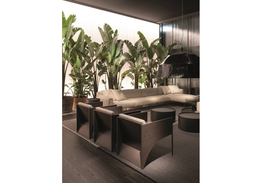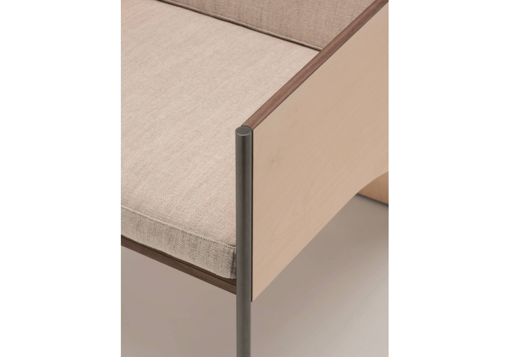 Ark von David Lopez Quincoces für Living Divani entworfen, ist ein Sessel mit einer Struktur aus Birkensperrholzplatten, die im unteren Teil gebogen und in verschiedenen Ausführungen furniert sind. Vorderbeine aus gezogenem Rundstahl, lackiert mit graugrauem oder brüniertem Epoxidpulver, mit austauschbaren PVC-Füßen. Abnehmbarer Bezug in verschiedenen Stoffen oder Ledern.