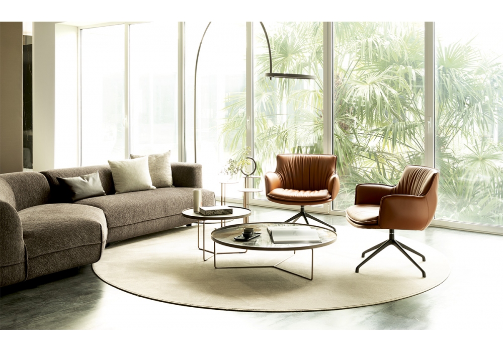 Rhonda Lounge von Luca Signoretti für Cattelan Italia entworfen, ist ein Drehsessel mit 4-Stern-Fußkreuz aus lackiertem Aluminium, Bezug aus Stoff, Mikronubuk, Kunstleder oder Leder. Erhältlich in verschiedenen Ausführungen und Größen.