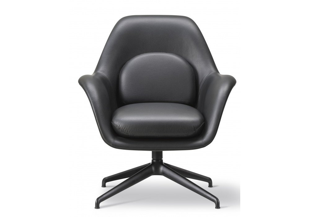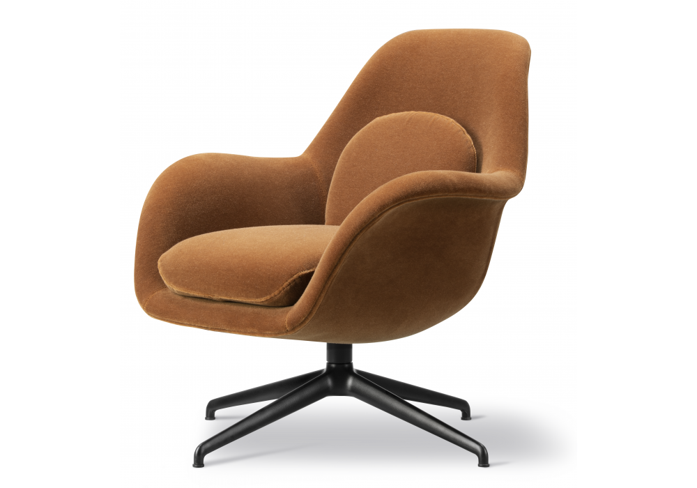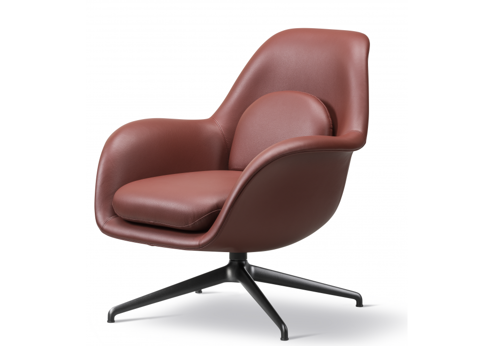 Swoon Lounge Petit von Space Copenhagen für Fredericia entworfen, ist ein vollständig gepolsterter Drehsessel mit drehbarem Aluminiumfuß. Innenschale aus unter Hochdruck geformtem Polyurethanschaum, verstärkt durch einen Stahlrahmen. Abnehmbares Sitz- und Rückenkissen aus emissionsarmem Schaumstoff, mit abnehmbarem Bezug. Erhältlich in Stoff oder Leder.