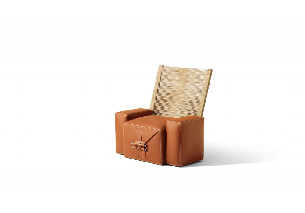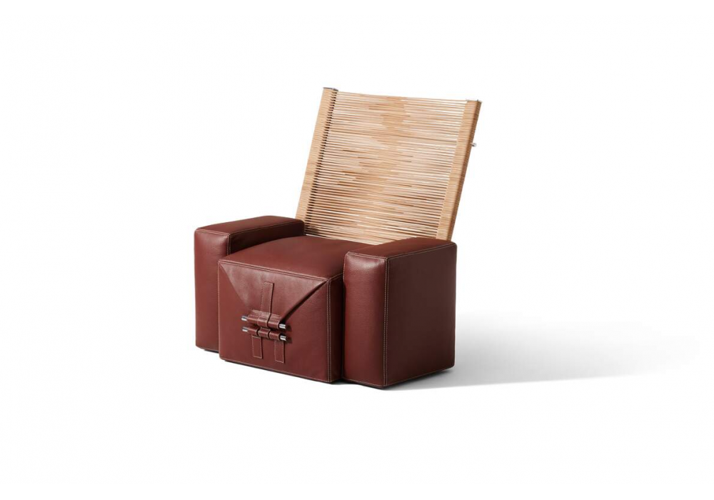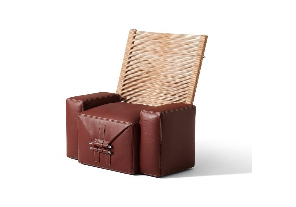 Somewhere El-S von Philippe Starck für Cassina entworfen, ist ein Sessel mit geflochtener Rückenlehne aus Naturleder, Sitz aus Bogolan-Stoff oder Voyage-Leder. Die Armlehnen sind immer aus Voyage-Leder mit Profil in der gleichen Ausführung.