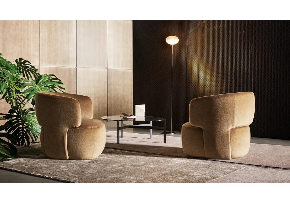 Doge von Mauro Lipparini für Bonaldo entworfen, ist ein Sessel mit Metallstruktur, drehbarem Metallfuß mit automatischem Rückholmechanismus oder festen Füßen, Holzsitz mit elastischen Gurten, Polsterung aus geformtem Polyurethanschaum, Bezug aus Stoff oder Leder.