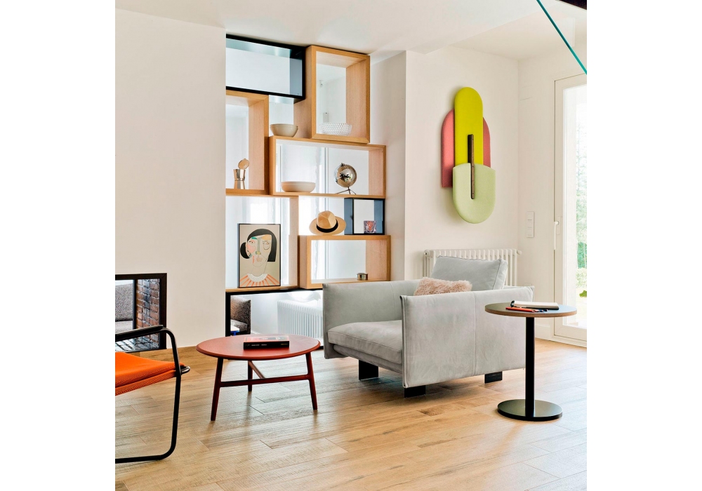 Deep, von Rafa García für Sancal entworfen, ist ein Sessel aus Holz, gepolsterter Sitz und Rückenlehne mit Stoff- oder Lederbezug, Beine aus lackiertem Aluminium. Verfügbar in verschiedenen Ausführungen und Größen.