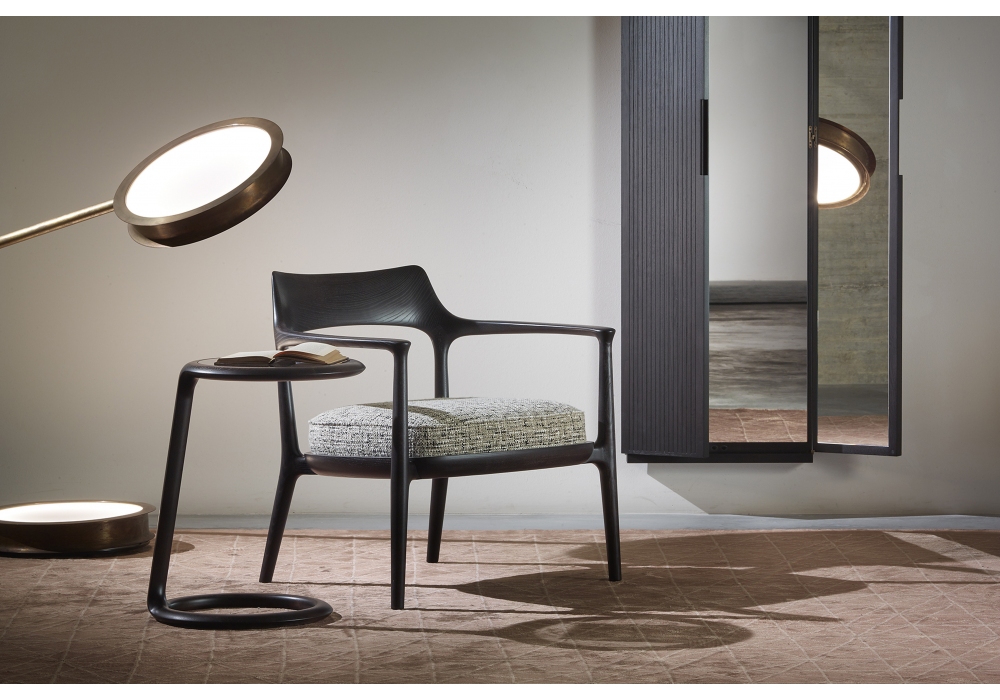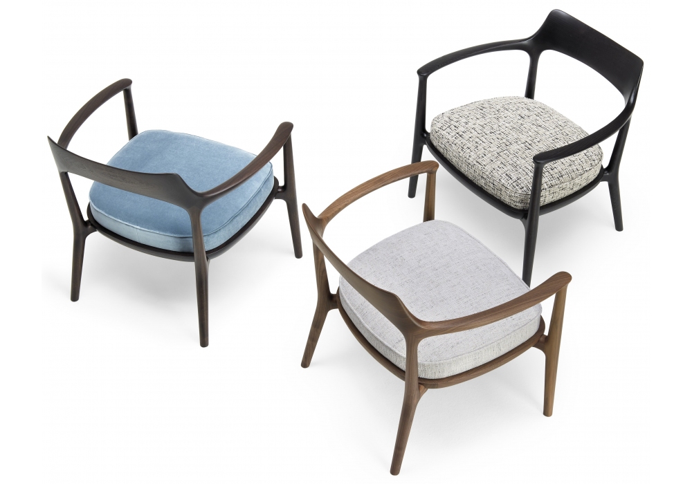 Janine Lounge von Roberto Lazzeroni für Ceccotti Collezioni entworfen, ist ein Sessel mit Struktur aus Nussbaum oder Esche Massivholz und Sitz mit Stoff- oder Lederpolsterung.