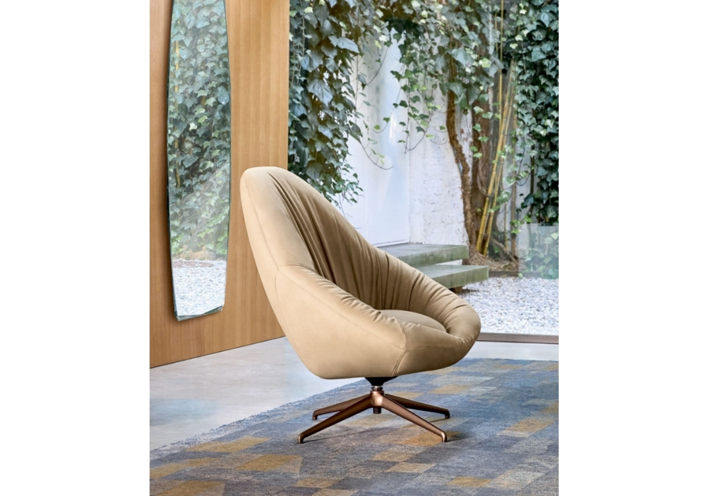 Bacio von Carlesi Tonelli Studio für Riflessi entworfen, ist ein Sessel mit Gestell aus Aluminiumdruckguss. Ergonomische Sitzfläche und Rückenlehne gepolstert. Polsterung aus flexiblem, kaltgeformtem Polyurethan, feuerfest und formstabil. Dekorativer Reißverschluss. Drehbares Gestell lackiert oder handgebürstet. Erhältlich mit oder ohne Fußstütze.