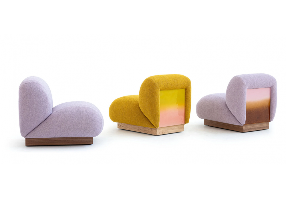 Clay von Zanellato/Bortotto für Moroso entworfen, ist ein Sessel mit einem Gestell aus Eichen- oder Walnussfurnierholz. Die Rückenlehne ist mit einer handgefertigten glasierten Keramikplatte versehen. Stoffbezug in verschiedenen Ausführungen.