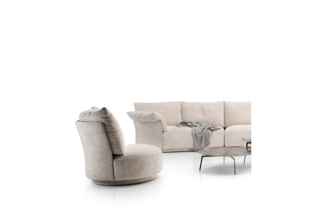Durante von Angelettiruzza für Alivar entworfen, ist ein Sessel mit festem oder um 360° drehbarem Fuß. Der Bezug ist aus Stoff in verschiedenen Ausführungen.