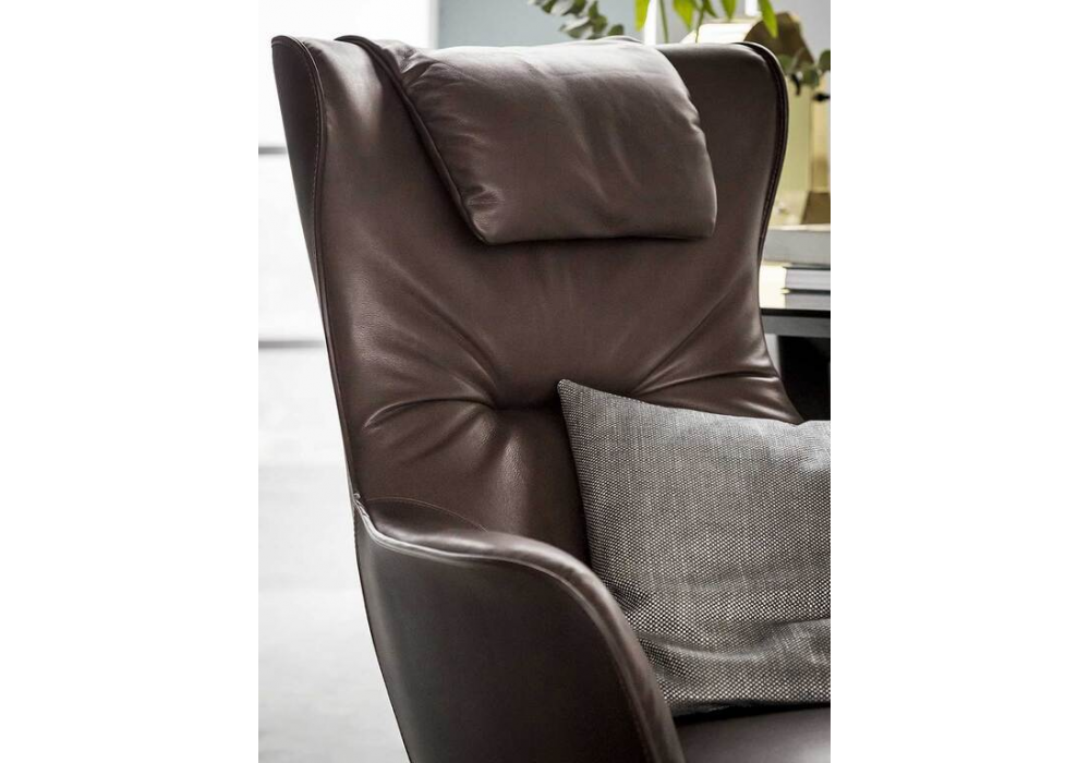 Mamy Blue, von Roberto Lazzeroni für Poltrona Frau entworfen, ist ein Sessel mit Vierfußgestell aus massiver Esche in zwei Ausführungen mit einer Ankerplatte, die ihn an der Schale aus schwarz lackiertem Stahl befestigt. Erhältlich in Vollpolsterung mit Pelle Frau®-Leder (auch in zweifarbiger Ausführung) oder in einer Kombination aus zwei Materialien. Die Kombination der Materialien wird durch die eleganten sichtbaren Nähte hervorgehoben. Optionale Kopfstütze nicht im Preis inbegriffen.