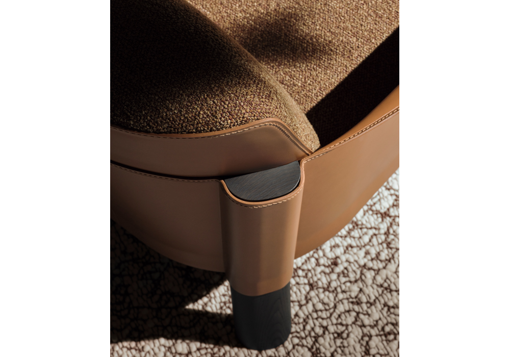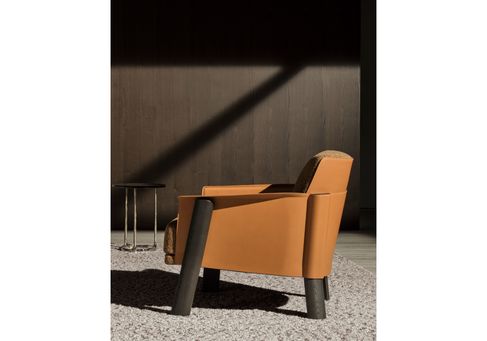 Armand von Christophe Delcourt für Molteni&C entworfen, ist ein Sessel mit einem Stahlrahmen, der mit regeneriertem Leder bezogen ist, und Beinen aus massiver Esche. Die Sitzfläche besteht aus Sperrholz mit elastischen Gurten und einer Polsterung aus Polyurethan mit variabler Dichte. Die thermogeformte Rückenlehne ist mit Leder bezogen und verfügt über ein Kissen aus Verbundmaterial und hochbeständigem Polyurethan. Erhältlich mit Stoff- oder Lederbezug und in den Ausführungen Kaffee- oder Bernstein-Eiche.