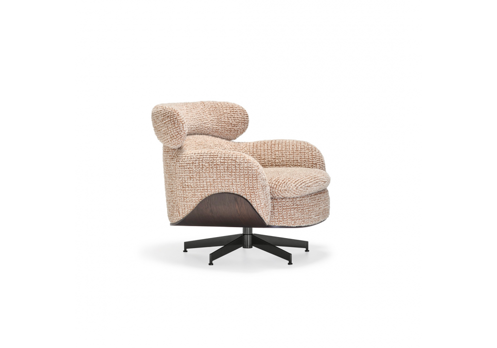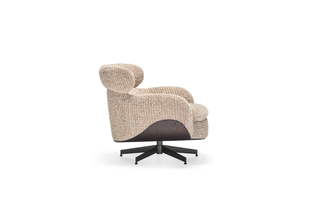 Leonard von Christophe Delcourt für Molteni&C entworfen, ist ein Sessel mit einer geschwungenen Schale aus mit Kaffee-Eiche furniertem Sperrholz und einem Gestell aus Sperrholz und Polymex, gepolstert mit Polyurethanschaum unterschiedlicher Dichte. Das Sitzkissen besteht aus geformtem Polyurethan und Polyesterfasern. Die Rückenlehne und die Kopfstütze sind mit hochfestem Schaumstoff gepolstert. Das Drehgestell aus poliertem, zinnfarben lackiertem Stahl verfügt über eine 360°-Dreh- und Rückstellfunktion und ist mit rutschfesten Gleitern ausgestattet. Erhältlich mit Stoff- oder Lederbezug.