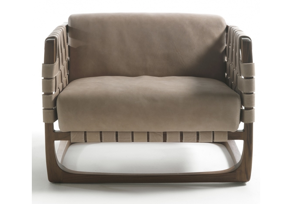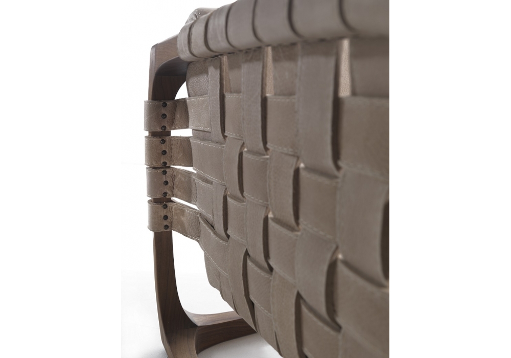 Bungalow von Jamie Durie für Riva 1920 entworfen, ist ein gepolsterter Sessel mit Struktur aus Massivholz, komplett von Hand gedrechselt, zusammengesetzt und geschliffen. Ein Geflecht aus Leder- oder Stoffschnüren prägt Sitzfläche, Rückenlehne und Armlehnen.