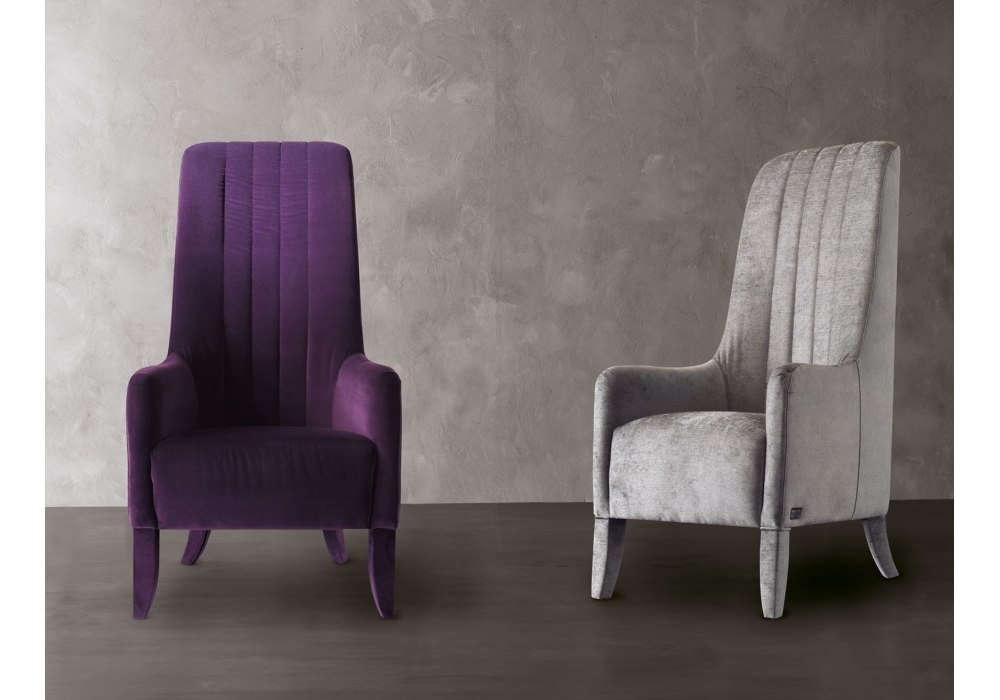 Cleo von Rugiano entworfen, ist ein Stuhl mit Struktur aus Stoff oder Leder in verschiedenen Ausführungen und Holzfüßen.