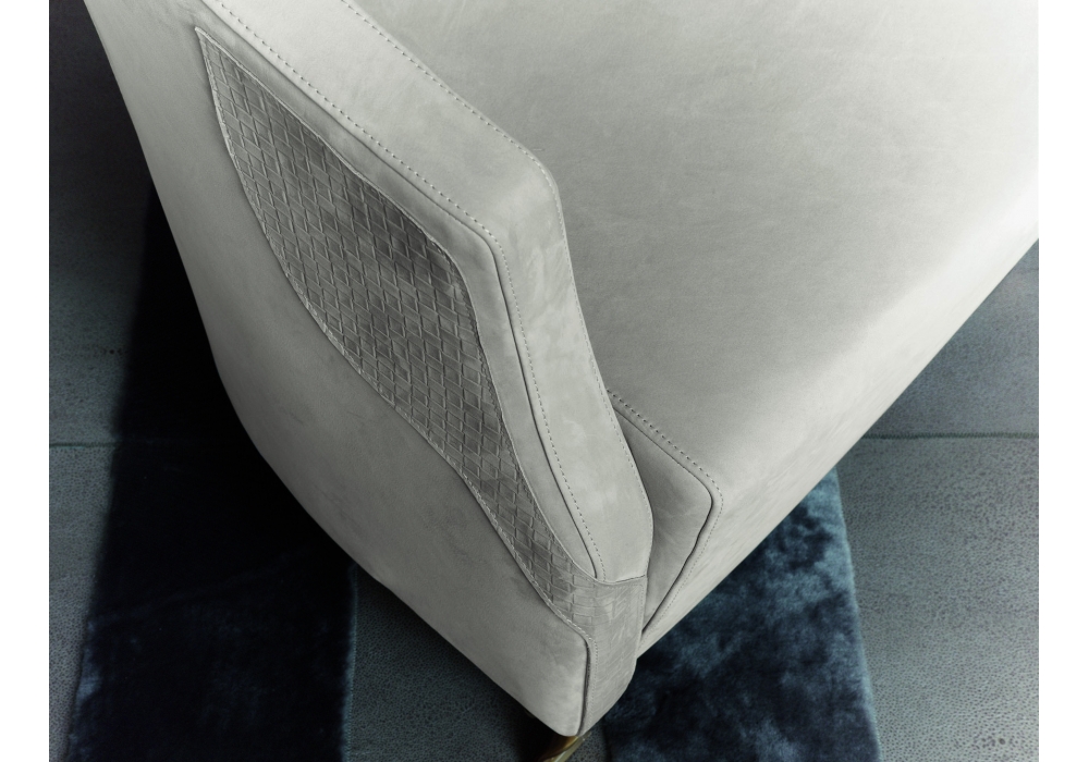 Angel von Rugiano entworfen, ist ein Sessel mit Stoff- oder Lederbezug. Bronze- oder verchromte Struktur und gepolsterte Beine. Erhältlich in verschiedenen Ausführungen.