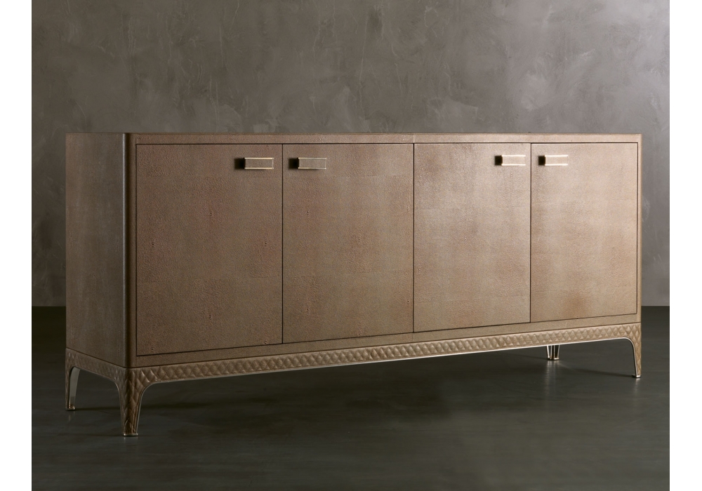 Joi von Rugiano entworfen, ist ein Sideboard mit Struktur und Türen aus Leder, Beinen mit Matelassé-Verarbeitung und Details aus Stahl oder bronziertem Messing.
