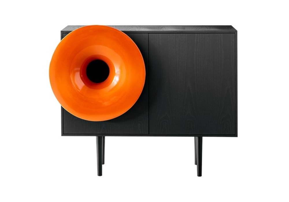 Caruso von Paolo Cappello für Miniforms entworfen, ist ein Sideboard mit Audiosystem. Struktur aus Holz und Trompete aus Keramik in verschiedenen Farben erhältlich. Erhältlich in zwei Größen und LED-Version.