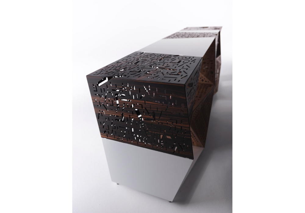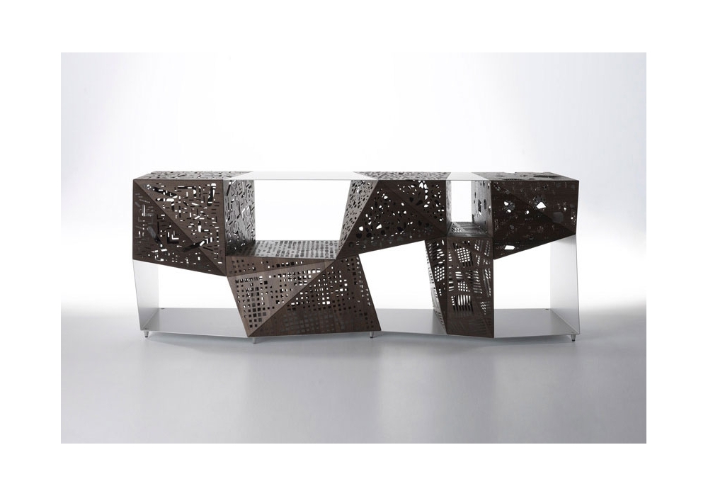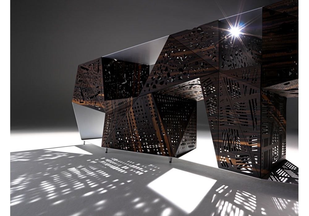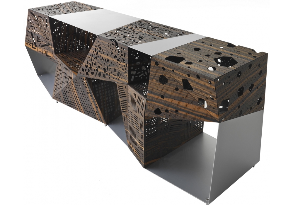 Riddled Buffet von Steven Holl für Casamania & Horm entworfen, ist ein Sideboard. Es besteht aus fünf verschiedenen Behältern, die mit einer zu öffnenden Tür mit Magnetverschluss ausgestattet sind und aus einem von Horm entwickelten und patentierten Material bestehen, das aus einem Sandwich aus Ebenholzfurnier und Stoff besteht, das dank der durch Laserschneiden erzeugten Oberflächeneinschnitte wie ein Origami gefaltet wird. Die Behälter sind durch lackierte Aluminiumplatten miteinander verbunden.
