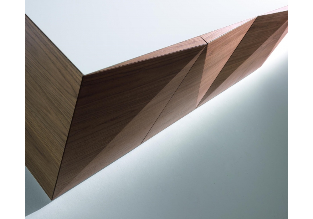 Not Riddled von Steven Holl für Casamania & Horm entworfen, ist ein Sideboard mit einer Struktur aus lackierten Holzspanplatten oder MDF-Platten. Seiten und Türen bestehen aus einem von Horm entwickelten und patentierten Material, das aus einem Sandwich aus Canaletto-Walnussfurnier und Stoff mit einer Dicke von 2,2 mm besteht, der dank der mit Laserschnitten hergestellten Oberflächeneinschnitte wie ein Origami gefaltet wird. Regale aus transparentem gehärtetem Glas, polierte Kante, 5 mm dick.