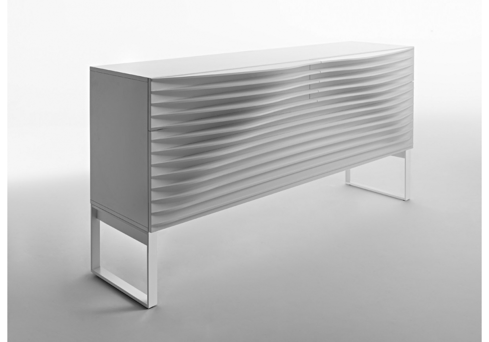 Tide von Karim Rashid für Casamania & Horm entworfen, ist ein Sideboard mit Struktur, Klapptür und Schubladenfronten aus beschichteten und lackierten Spanplatten. Wellen an der Tür und an den Schubladenfronten aus lackiertem MDF. Schubladen mit selbstbremsenden Führungen und eloxierten Aluminiumseiten. Obligatorischer Metallsockel.